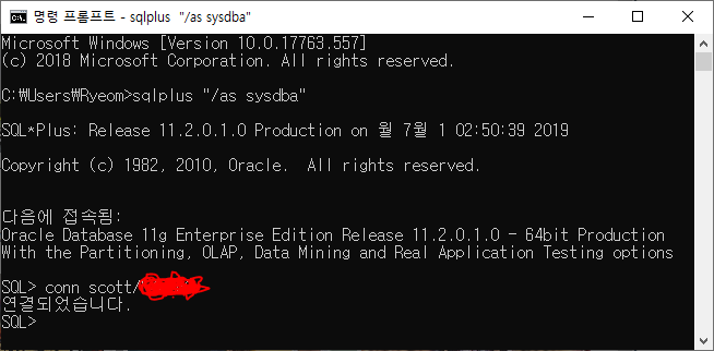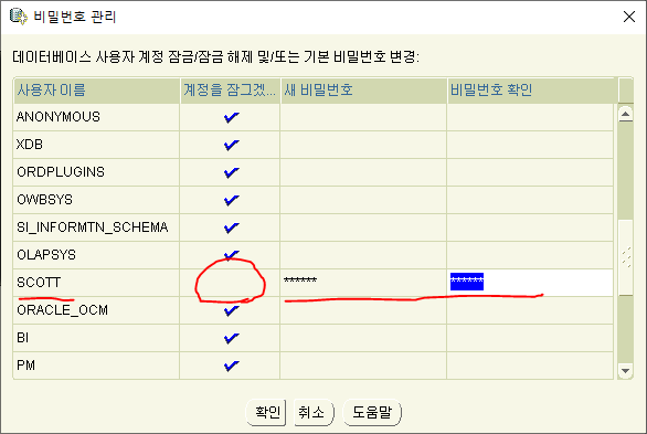 걍 scott쓰자 계정 풀어주고 비번 설정 ㄱㄱ