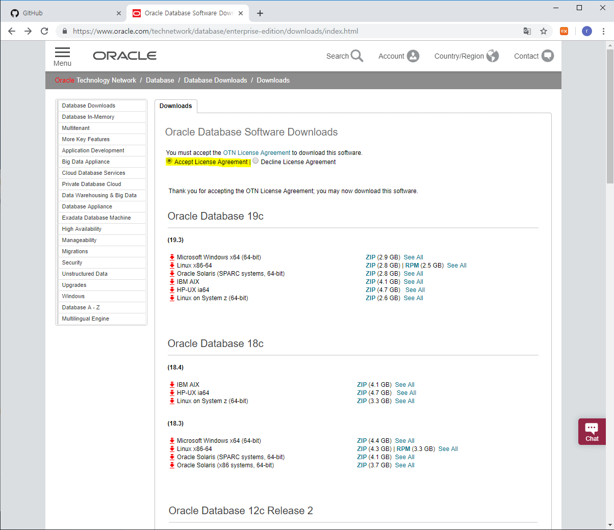 Thank you for accepting the OTN License Agreement; you may now download this software. Oracle Database 19c (19.3) Oracle Database 18c (18.4) (18.3) Oracle Database 12c Release 2 (12.2.0.1.0) - Standard Edition 2 and Enterprise Edition Oracle Database 12c R