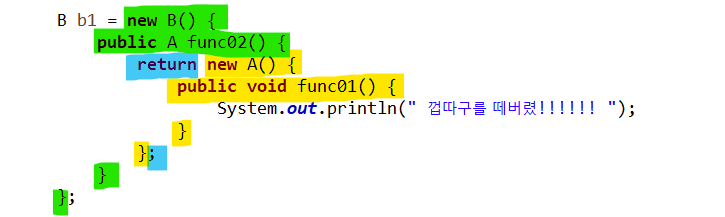 B b4 = () -> () -> System.out.println("/* new B -> func02 -> */ /* return -> */ /* new A -> func01 */ ->출력");