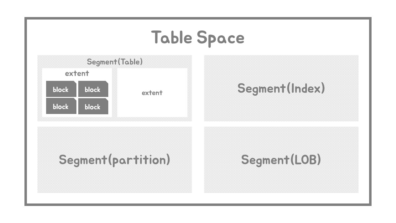 Segment : Table, Index 처럼 data 저장공간이 필요한 object. Segment 부족 시 tablespace로부터 extent를 추가로 할당 받음. (파일 경합을 줄이기 위해)