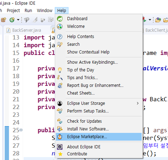 자 이클립스 상단메뉴 help를 보시면 Marketplace가 있습니다.